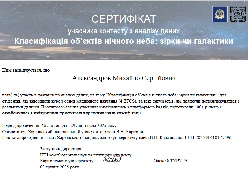 Здобувач ОПП «Інформаційні системи та технології» 2 року навчання Михайло Александров (група 6.04.126.010.24.1) та доцент кафедри ІКТ Олексій Гороховатський взяли участь в контесті «Класифікація об’єктів нічного неба: зірки чи галактики», проведеному ННІ комп’ютерних наук та штучного інтелекту Харківського національного університету імені В.Н. Каразіна.